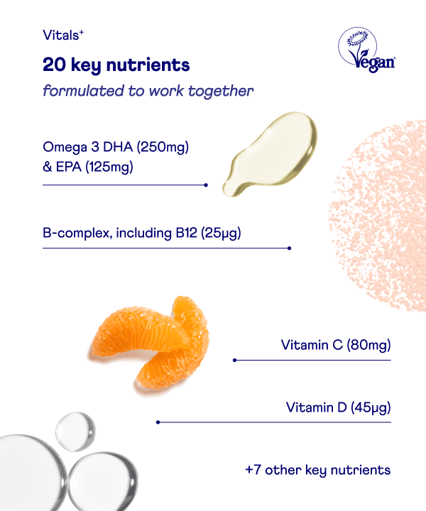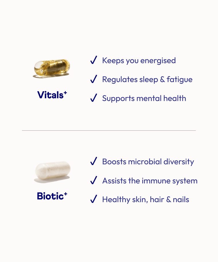 This bundle offers the most convenient way to get all the benefits from our Vitals⁺ and Biotic⁺—20 essential nutrients and 20bn live bacteria in one easy-to-manage plan.