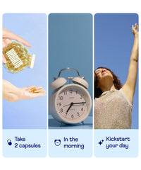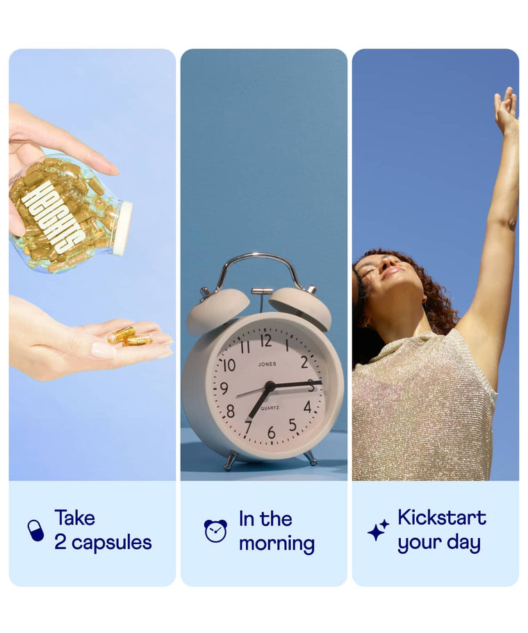 Take 2 capsules a day with a glass of water or juice. We recommend taking both first thing so you don’t forget. But any time is fine, with or without food.