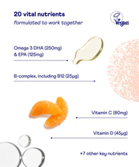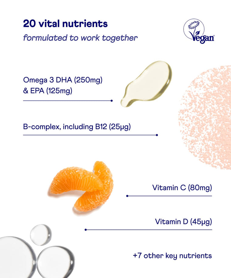 Algae Oil, Outer Capsule (Hydroxypropyl Methylcellulose), Delayed Release Capsule (Hydroxypropyl Methylcellulose, Gellan Gum), Ascorbic Acid (Vitamin C), Bilberry Extract (Anthocyanins), Tocopherol succinate (Vitamin E), Calcium Pantothenate (Pantothenic Acid - Vitamin B5), Thiamine Hydrochloride (Vitamin B1), Pyridoxal-5 phosphate (Vitamin B6), Nicotinamide (Niacin, Vitamin B3), Riboflavin (Vitamin B2), Ferronyl Iron (Iron), Zinc Citrate dihydrate (Zinc), Vegan Cholecalciferol (Vitamin D3), Peppermint Oil, Retinol Acetate (Vitamin A), Chromium Picolinate (Chromium), (6S)-5-methyltetrahydrofolic acid (Folic Acid), Potassium Iodide (Iodine), Selenium methionine (Selenium), D-Biotin (Biotin), Methylcobalamin (Vitamin B-12).